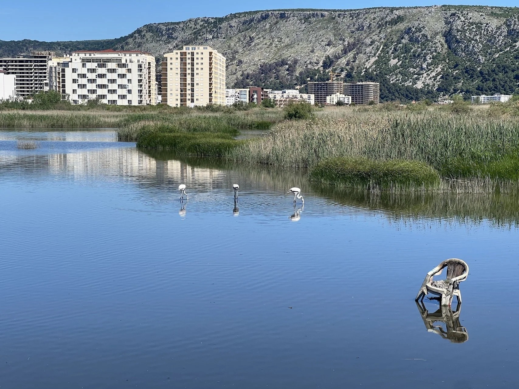 Mojim cieľom bolo spraviť autentické urban wildlife fotografie. Podarilo sa nám to pri rozsiahlej lagúne, kde mali plameniaky v pozadí rozostavané hotely a žeriavy. Večer sme sa usadili v provizórnom maskovaní, no plameniaky sa držali mimo dostrel. Po dlhom čakaní sme sa nakoniec vzdali maskovania a začali sa po ceste okolo lagún prechádzať. Plameniaky náš pohyb, na rozdiel od striktného statického pozorovania, nebrali vôbec do úvahy. Stáli vo vode a filtrovali potravu, vydávajúc tiché, nosové zvuky. Práve táto vizuálna disonancia – ružový balet plameniakov s kontúrou betónového rozvoja v pozadí – vytvorila silný príbeh o súčasnom Albánsku, ktorý sme konečne mohli začať plniť do pamäťových kariet.